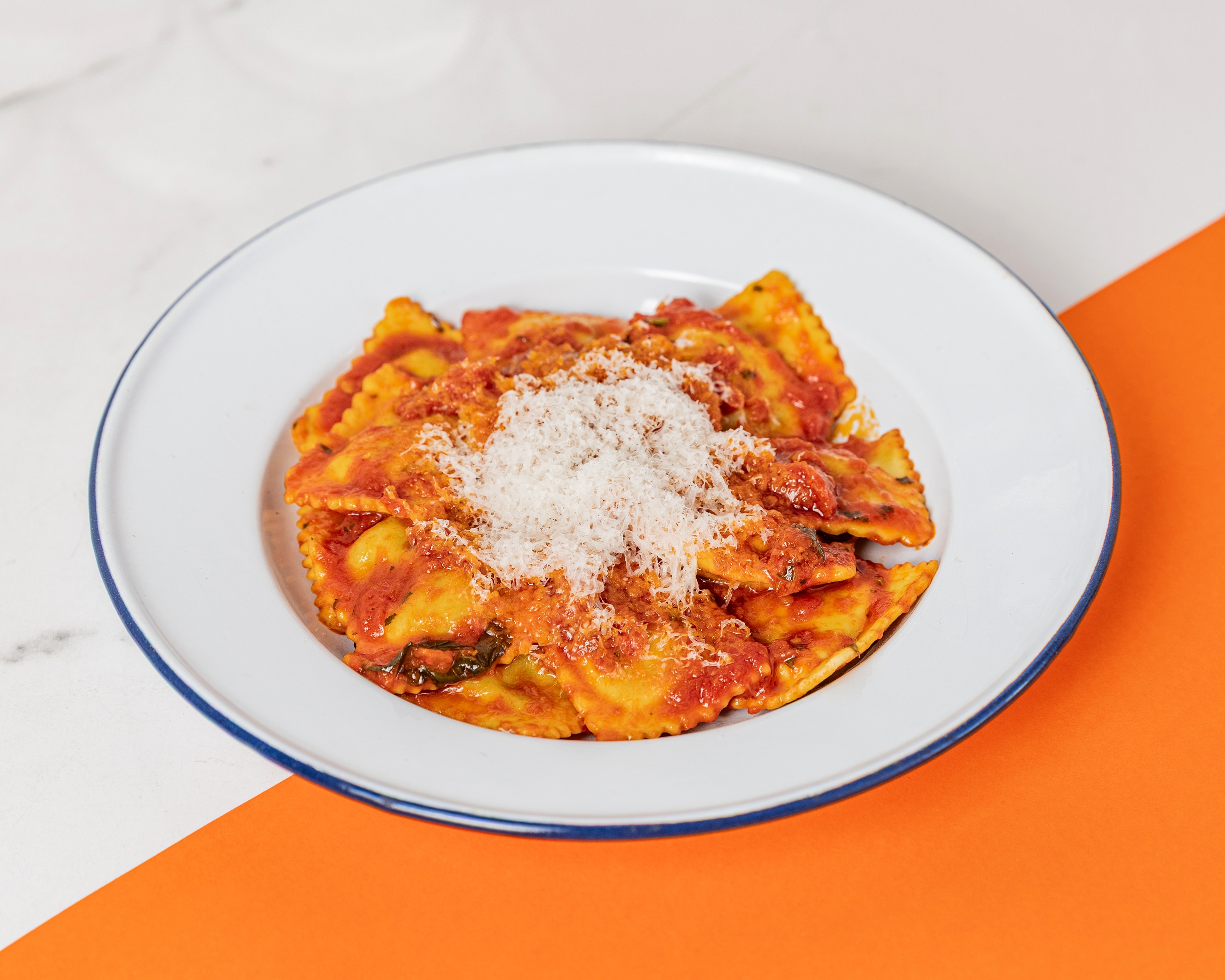 Ricotta and spinach ravioli with spicy tomato sugo. Topped with freshy grated Parmigiano