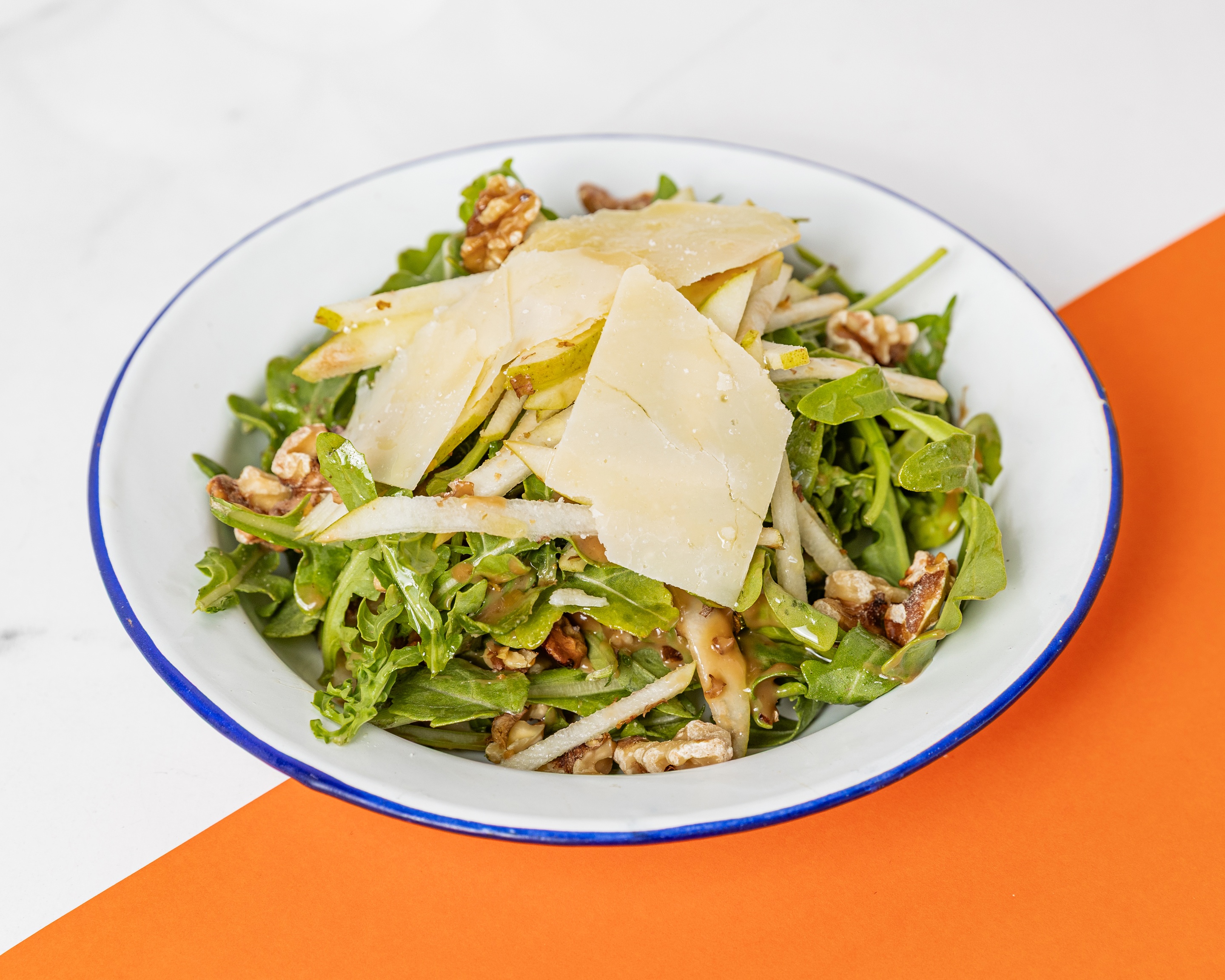Rocket, pears, shaved parmesan and walnuts.
