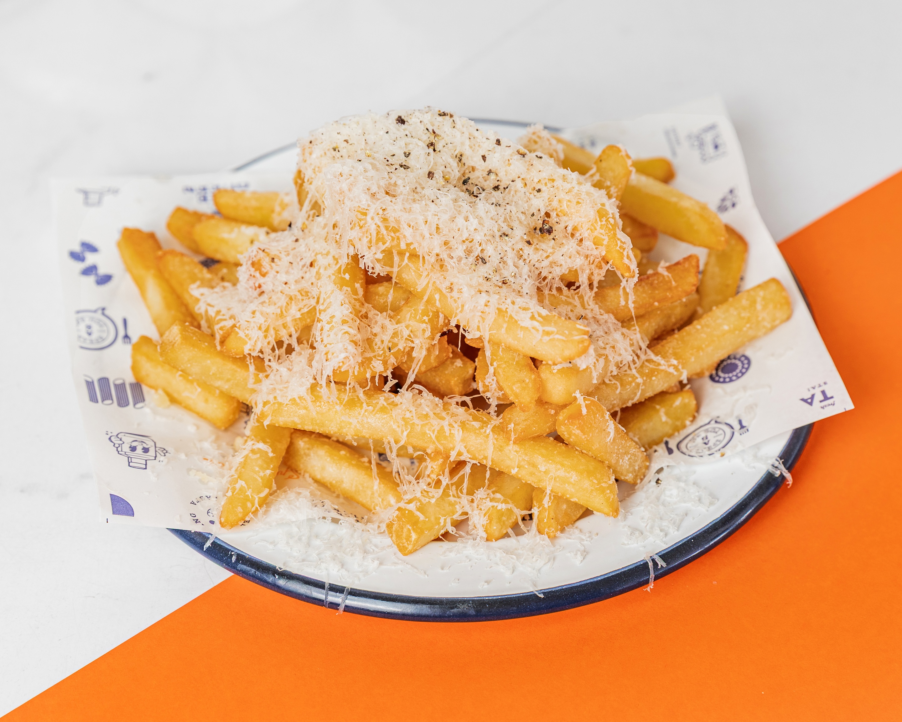 Fries topped with freshly grated pecorino cheese and black pepper