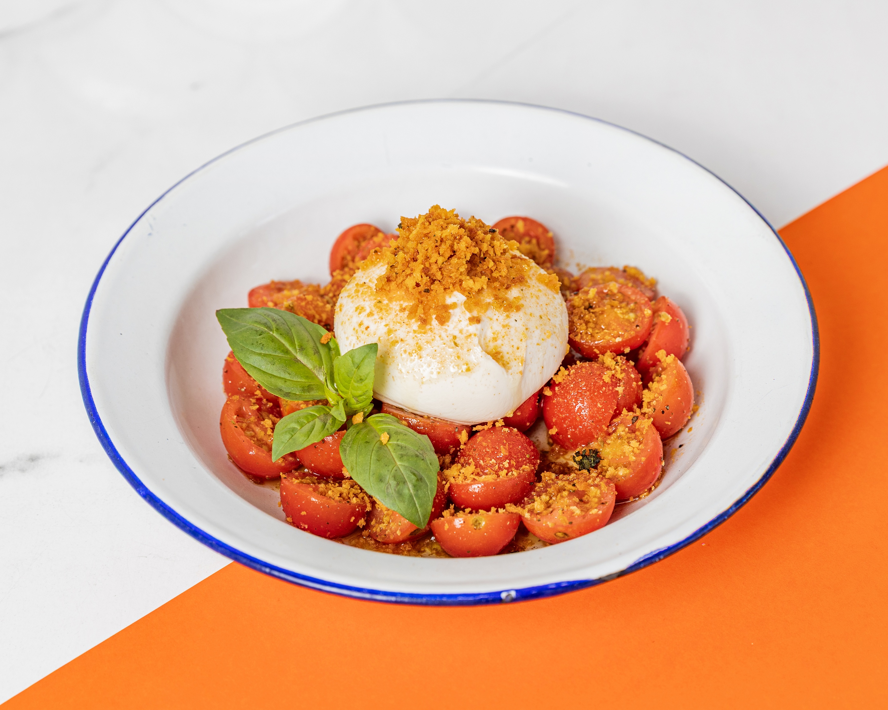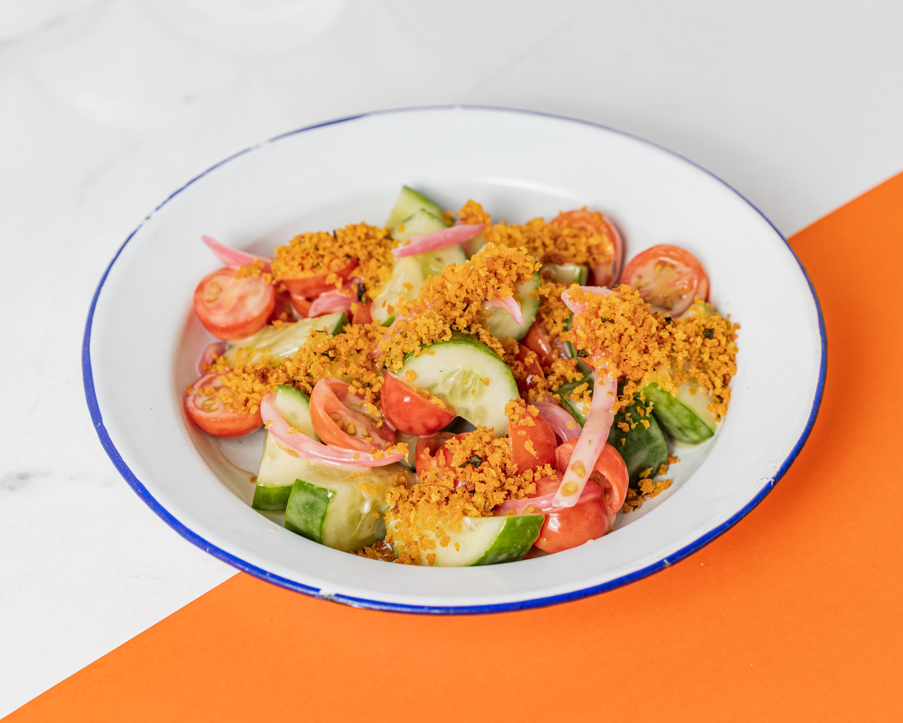 Cucumber, tomato, basil and pickled Spanish onions. Topped with lemon pangrattato.
