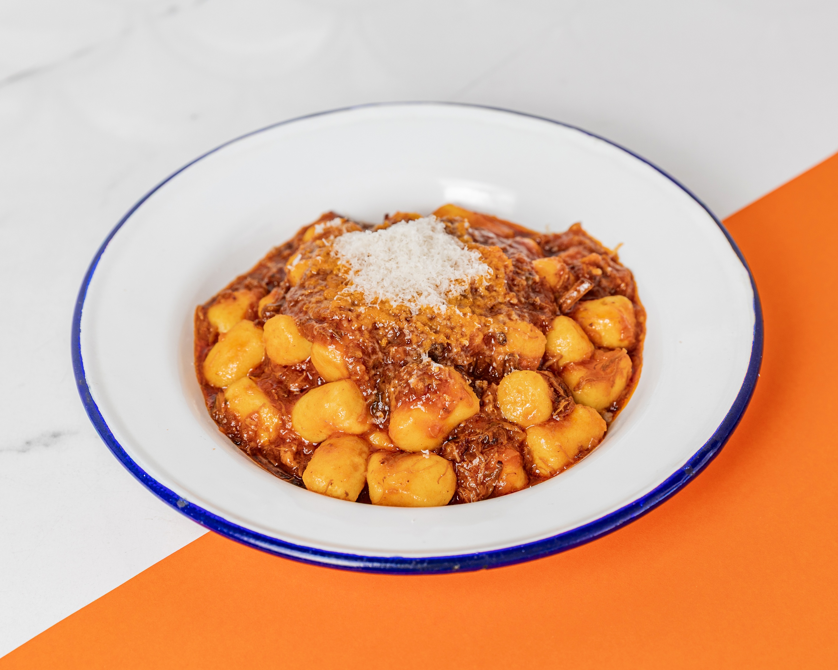 Traditional tomato sugo, beef and pork ragĂș. Topped with freshly grated parmesan.